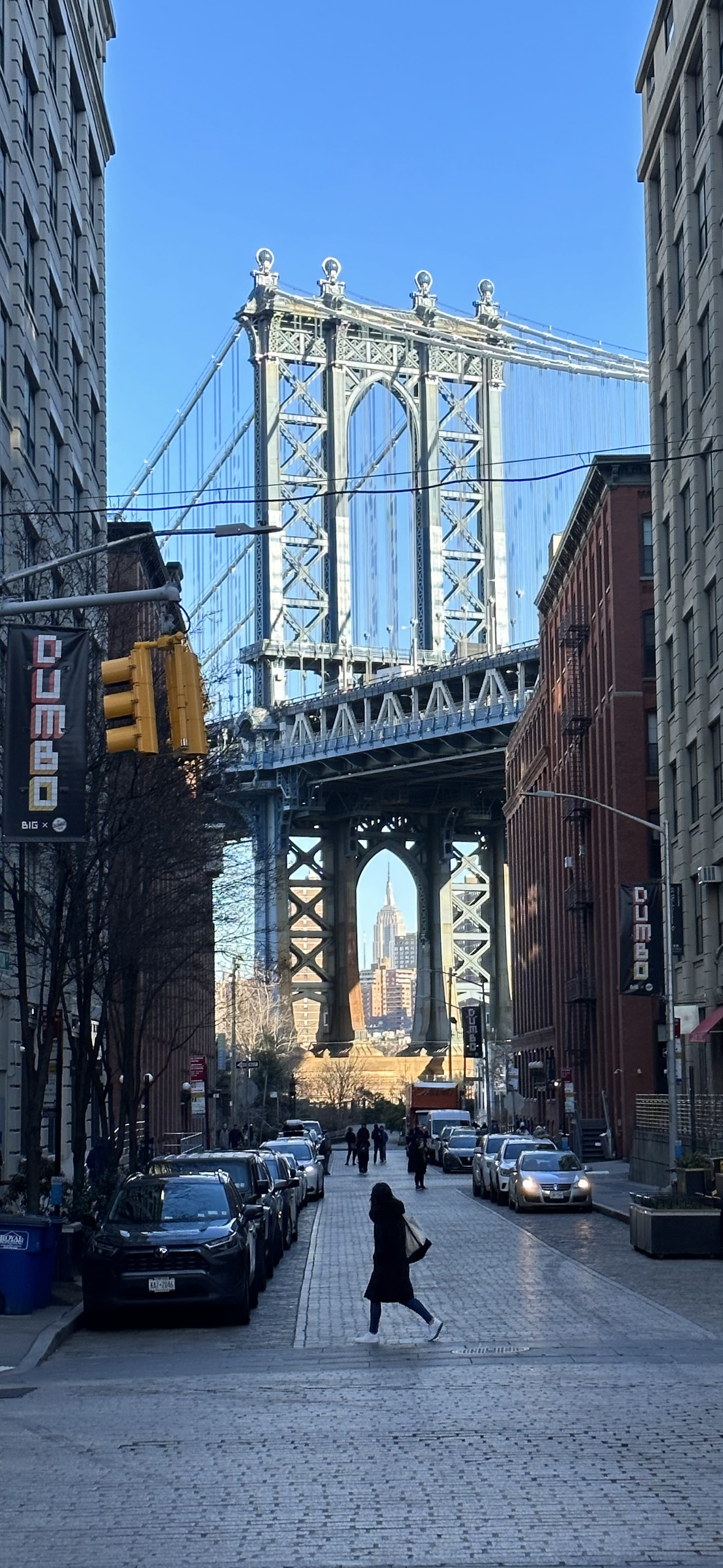 워싱턴 스트리트와 워터/프론트 스트리트 사이, 빨간 벽돌 사이로 맨해튼 브릿지가 프레임 되는 포인트. 저는 며칠 전에 미리 다녀와서 구도랑 포즈를 체크해 둔 덕분에, 현장에서는 딱 필요한 자리만 밟고 10–15분 컷으로 끝냈어요. 이른 아침일수록 한적하고, 벽돌·철골의 색감이 더 또렷합니다.