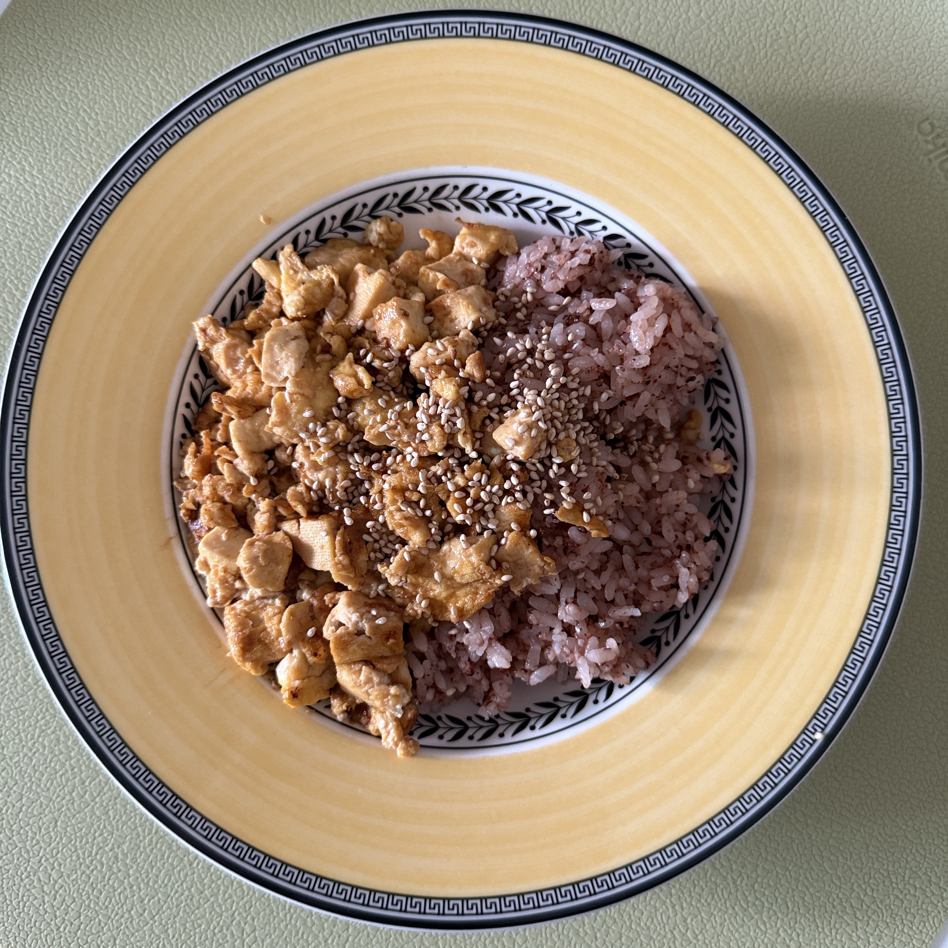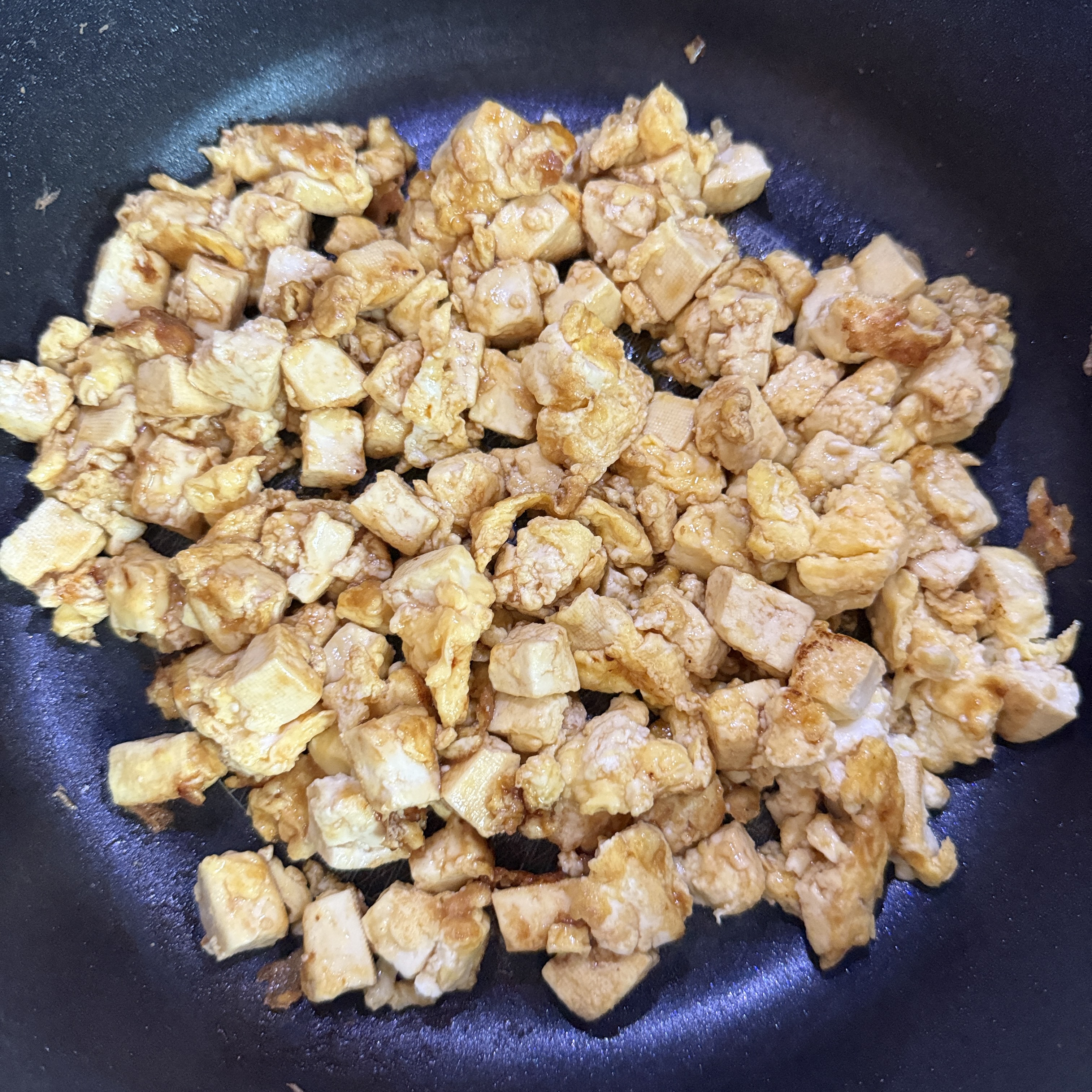 두부 200g, 계란 2개, 간장 2스푼, 굴소스 2스푼, 알룰로스 1스푼, 물 2스푼 → 두부 굽고 계란 넣기 → 소스 붓고 볶기 → 밥 위에 올려 참기름·참깨로 마무리!
