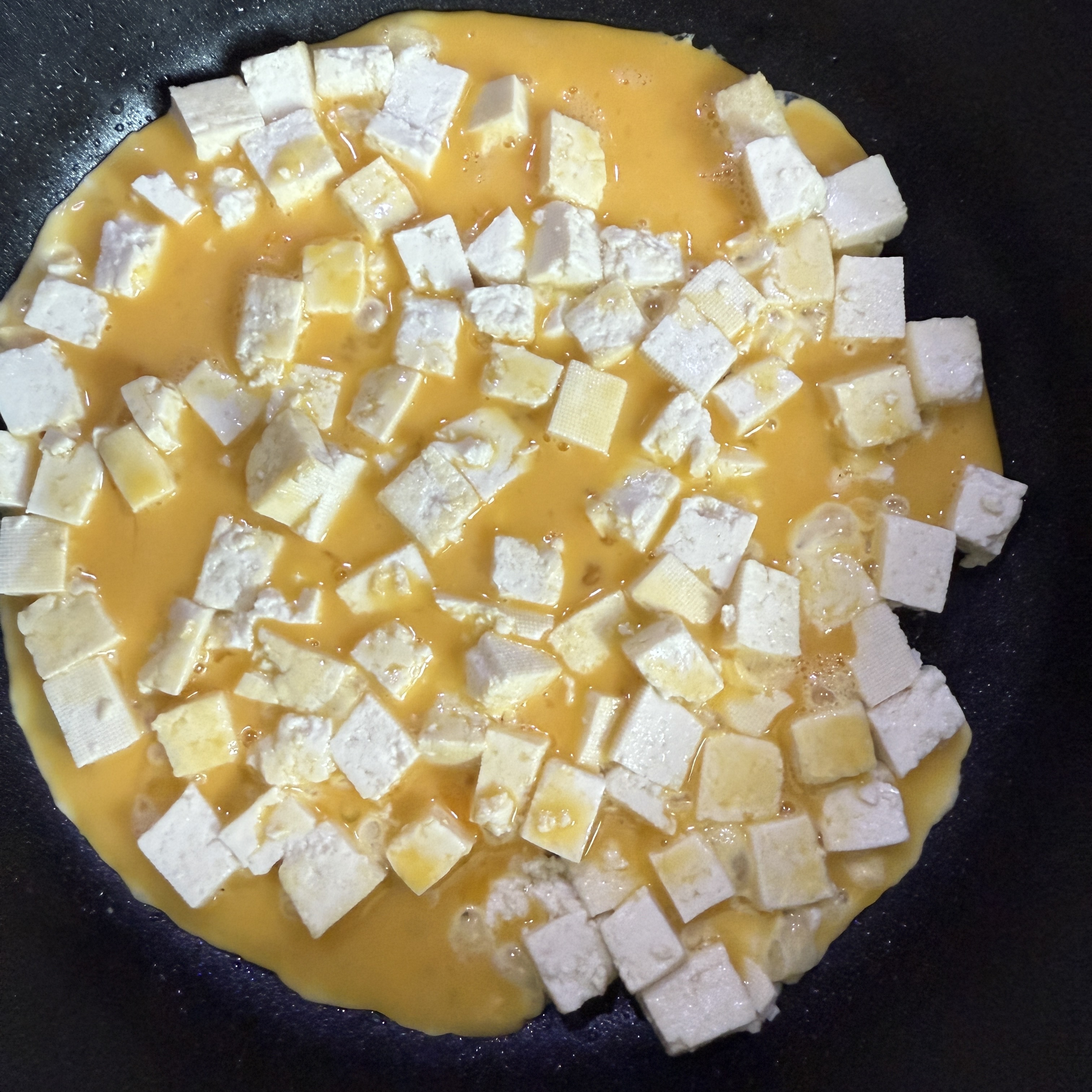 두부가 알맞게 구워지면 풀어둔 계란을 부어 두부와 부드럽게 섞어줍니다.