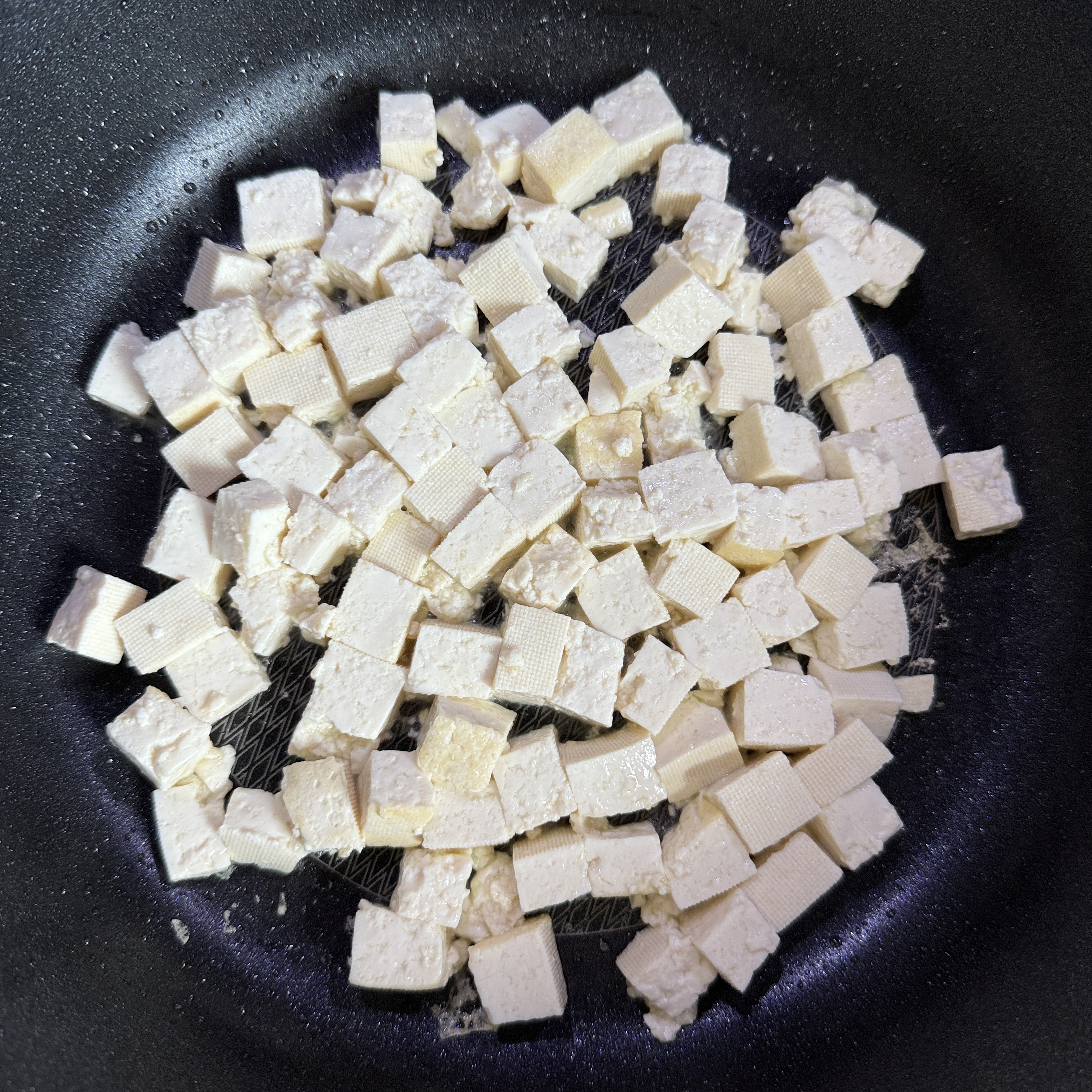 팬을 중불로 달군 뒤 두부를 올려 겉이 노릇노릇해질 때까지 볶아줍니다.